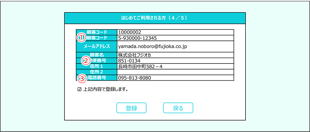 間違いがあれば[戻る]を、間違いなければ[登録]をクリックしてください。