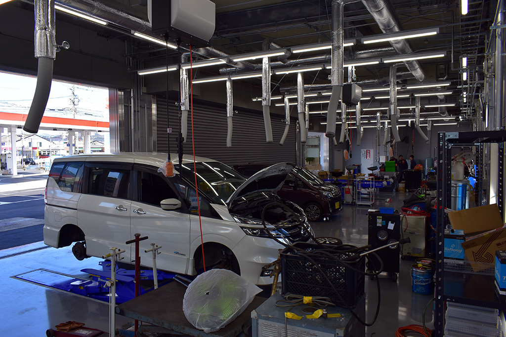 SS(サービスステーション)からの車検を中心に、お車のキズやヘコミの修理・鈑金、各種オイル交換、各種ランプ等の交換も承っております。年間3,000台の実績を誇り、早い・安い・安心をモットーに、完全な立ち合い見積りのもと、お客様のお車にあった整備を実施しております。お車のことは何でもご相談ください。
